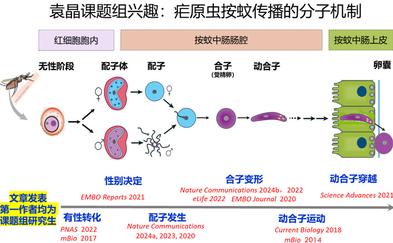 1.疟原虫按蚊传播中感染和寄生的分子细胞机制。疟原虫是单细胞真核生物,在雌性按蚊和脊椎动物动物两个宿主间交替传播,经历不同细胞阶段和显著差别的细胞形态和细胞功能。疟原虫如何在不同宿主阶段完成感染,寄生和传播?我们以鼠疟原虫-小鼠-按蚊为模型,重点关注疟原虫有性生殖的如下过程。